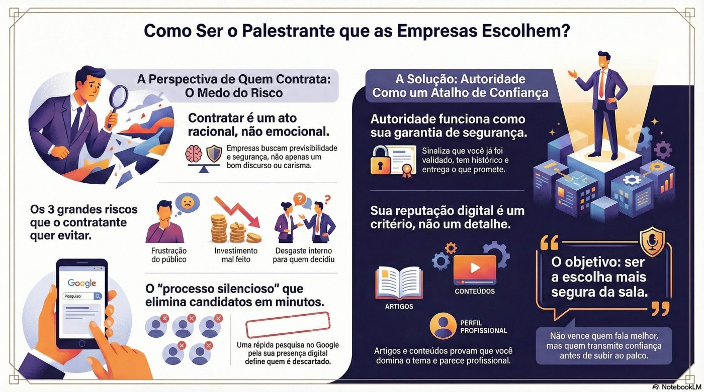 Mas, para quem contrata, o processo é muito mais racional do que emocional, sendo que as empresas não escolhem palestrantes apenas pelo conteúdo, mas também pelo nível de segurança que aquele nome transmite.
